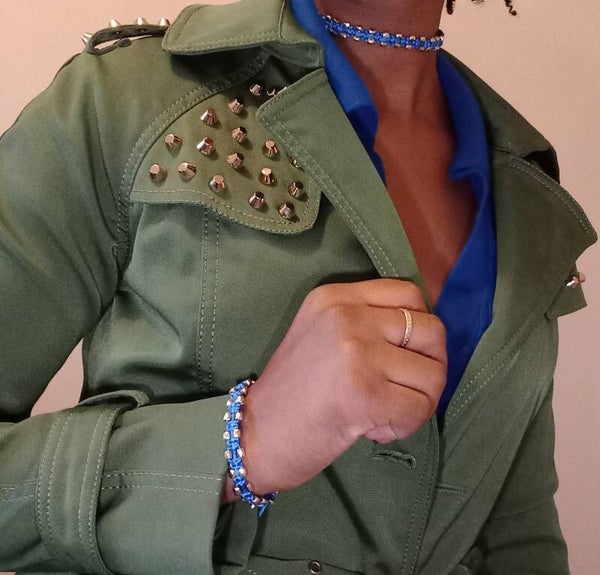 Il est orné de perle couleur or , ce qui fait fortement ressortir sa couleur bleu intense .