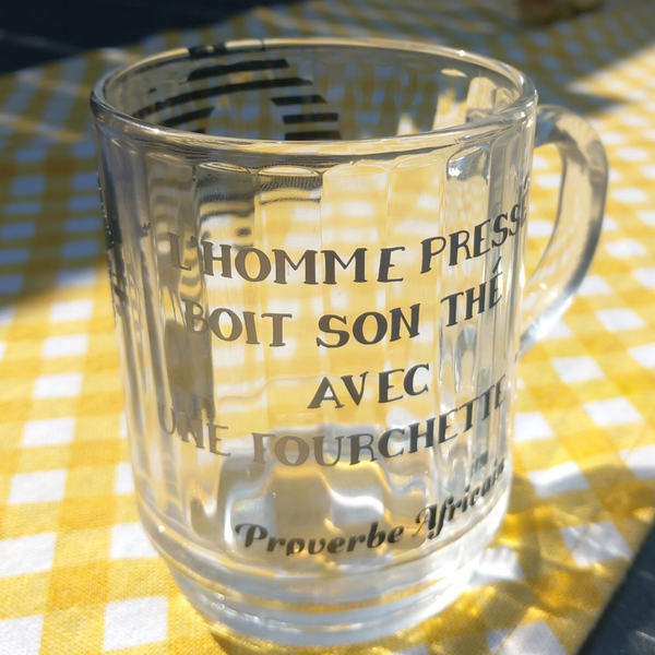 Dégustez votre boisson dans ce jolie mug tout en méditant sur cette citation africaine: " L'homme pressé boit son thé avec une fourchette."