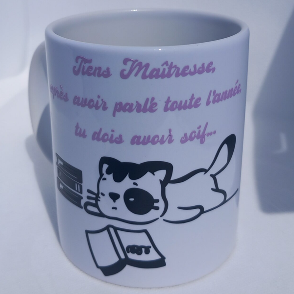 Dites le lui ! Pourquoi pas en lui offrant ce coffret originale comprenant un mug " Tiens maîtresse, après avoir parlé toute l'année, tu dois avoir soif..." et cette jolie paire de boucle d'oreille entière fait mais avec du bois naturel coloré.