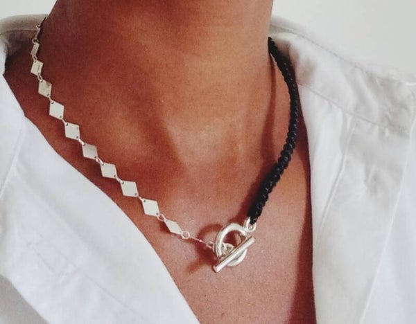 Fait de chaine de cuivre en losange et de fil de nylon.